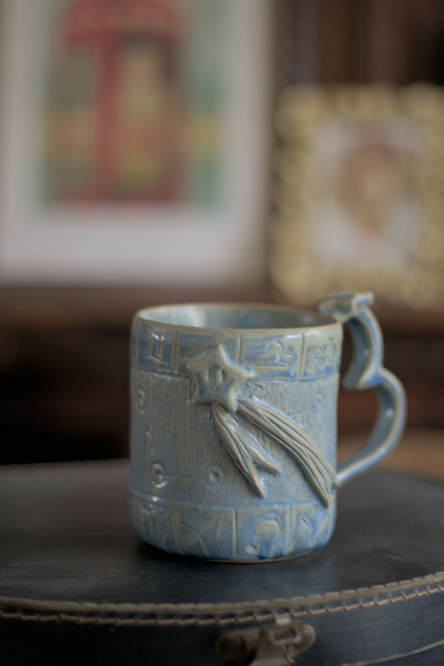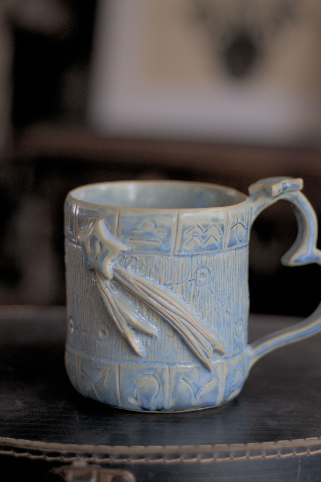 Mug en grès blanc émaillé en bleu pâle, réalisé dans le cadre du défi Claytober 2024.