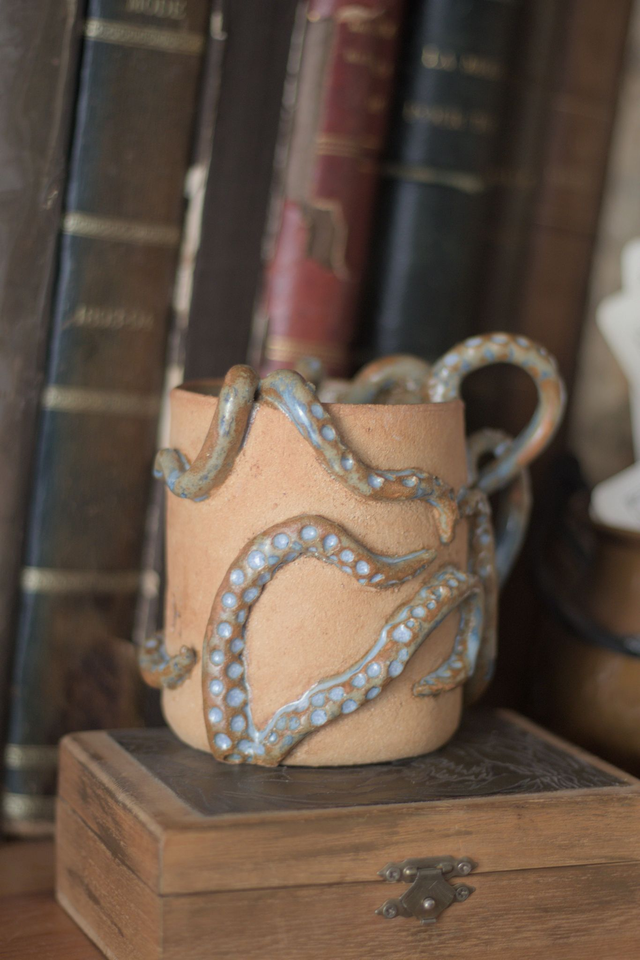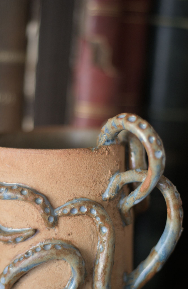 Mug en grès roux "Souvenir de R'lyeh", réalisé dans le cadre du défi Claytober 2024. L'intérieur et les tentacules sont émaillées en bleu clair.