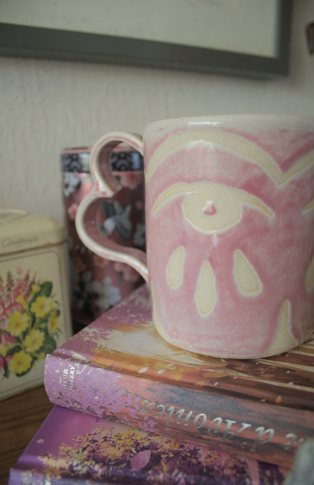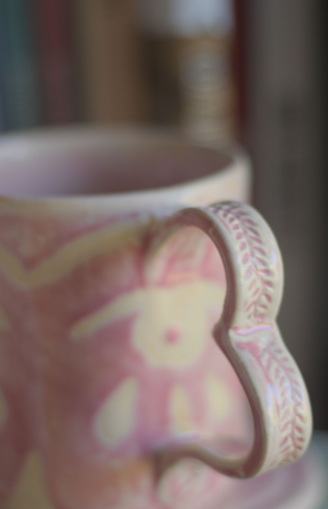 Mug en grès blanc émaillé en rose pâle, réalisé dans le cadre du défi Claytober 2024.