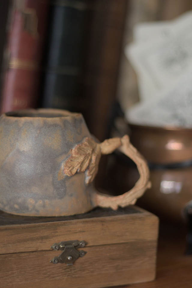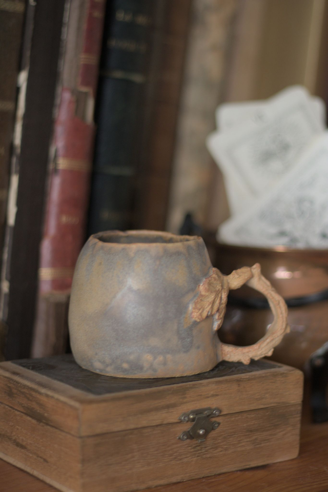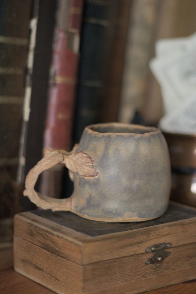 Tasse à café en grès roux avec un émail gris, réalisée dans le cadre du défi Claytober 2024.