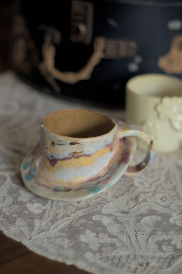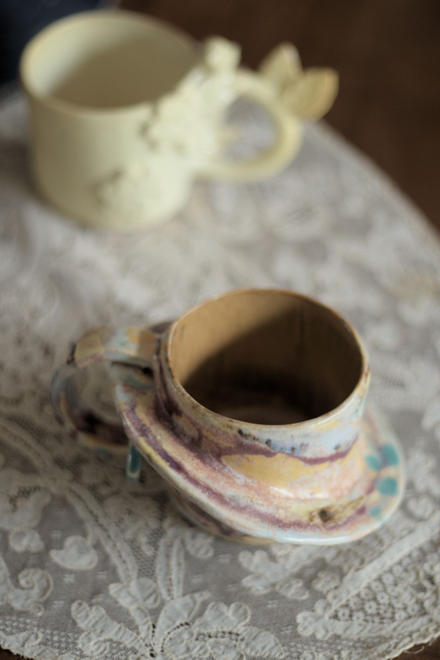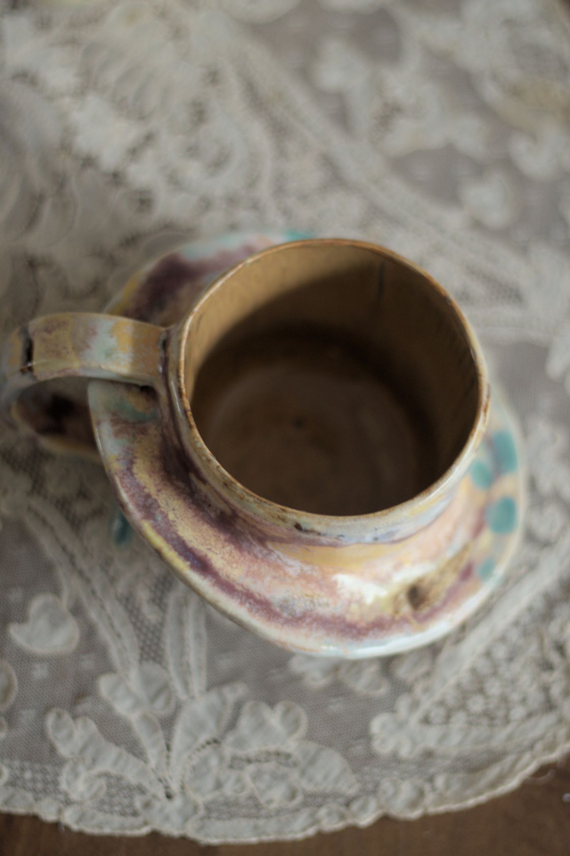 Tasse à café en grès blanc émaillée en multiples couleur à l’extérieur, ocre à l'intérieur, réalisée dans le cadre du défi Claytober 2024.