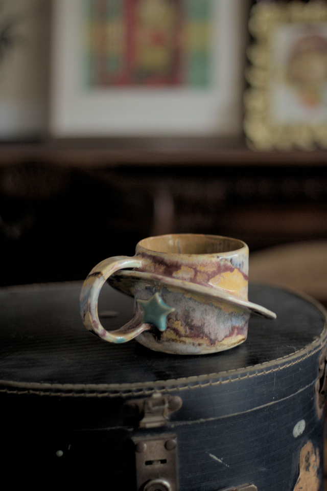 Pièce fabriquée à la plaque avec décor modelé à la main. Cette tasse comporte une pampille en forme d'étoile, accrochée a à la tasse par un fil métallique. Elle ne passe pas au micro-ondes.