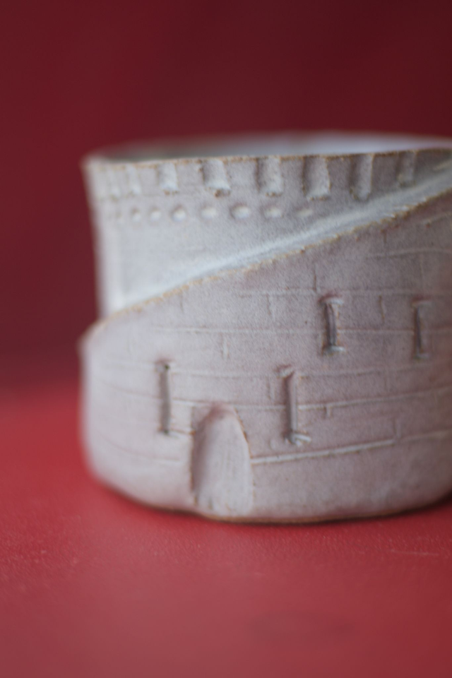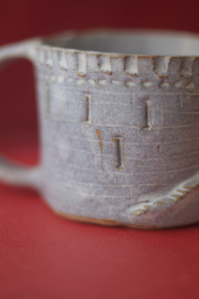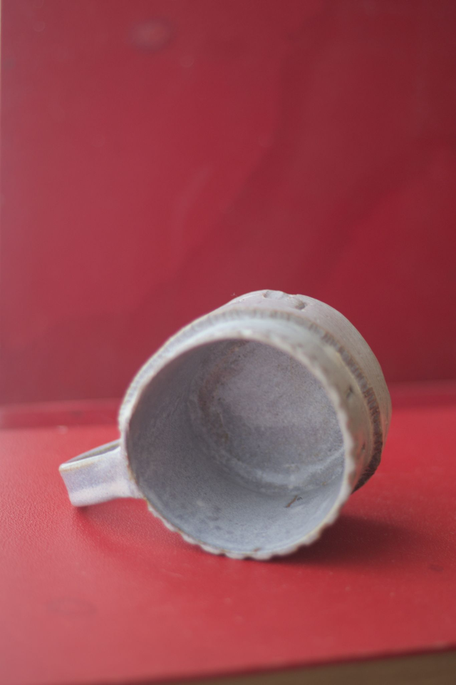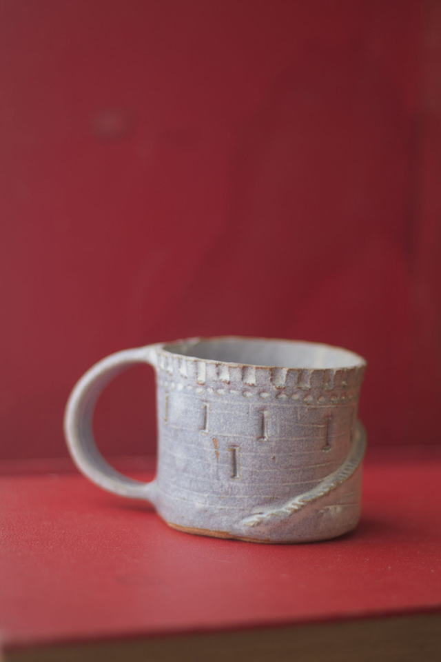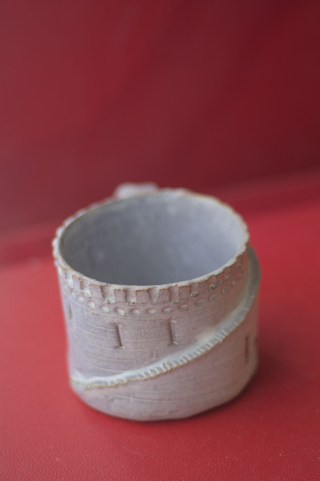 Tasse à café en grès roux émaillé en blanc satiné, réalisée dans le cadre du défi Claytober 2024.